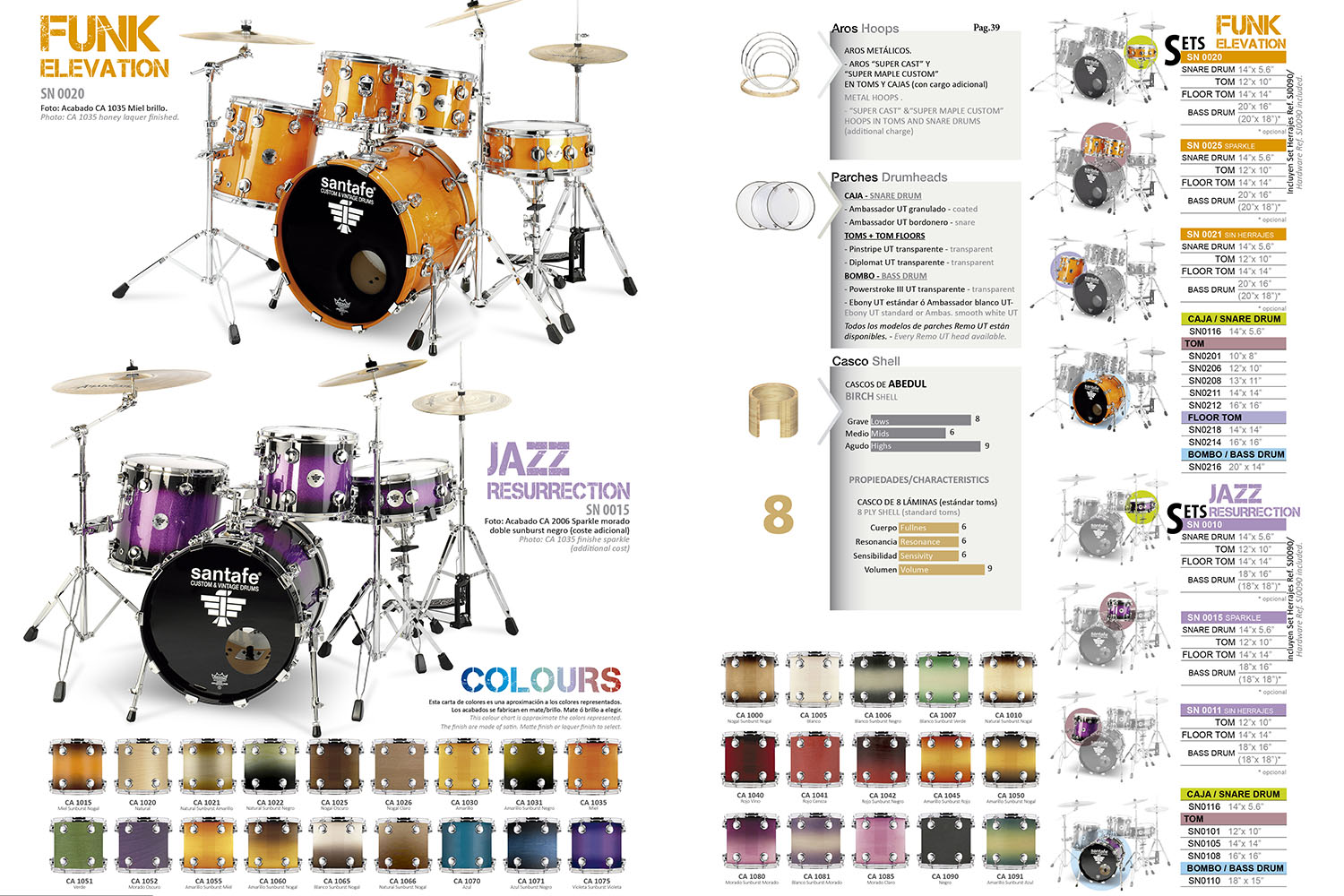 Hoops: Super Cast hoops or metal hoops depending of model. Bass drum have beech hoops.