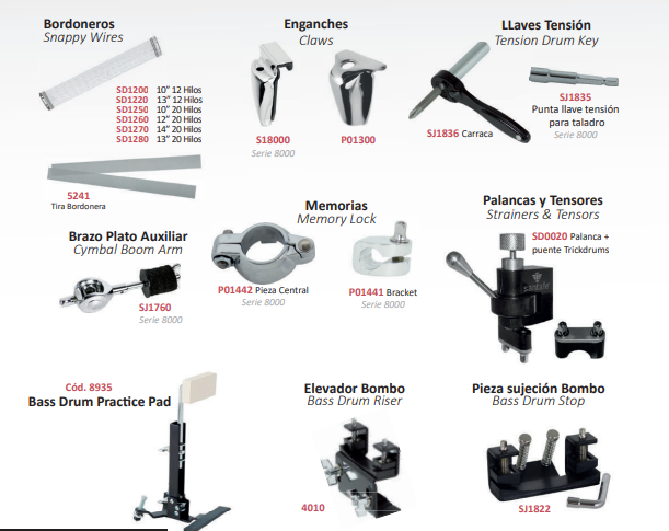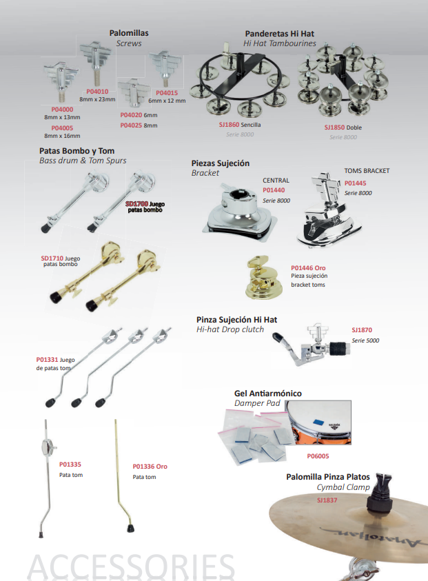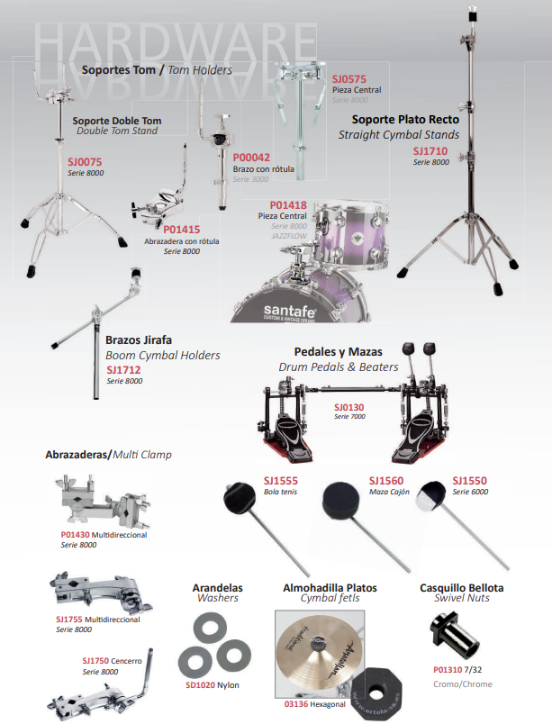 Hi hat stands, Straight cymbal stands, boom cymbal stands, snare stands, tom holders, boom cymbal holders, drum throne, drum pedals, ...
